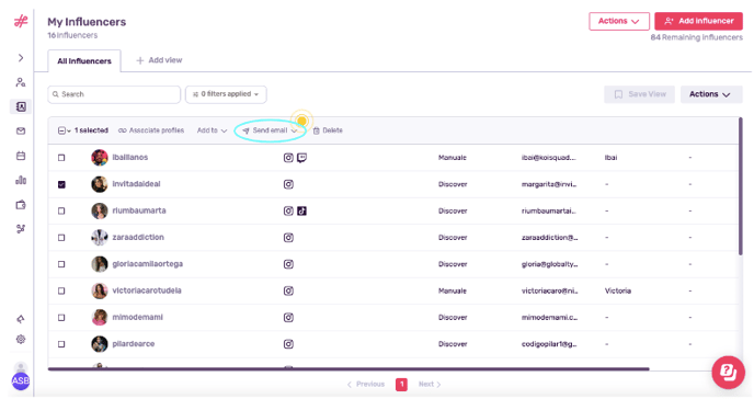 Go to the Influencers tab and select the option Influencers. Tick the box next to the influencers you want to contact and click Send email.
