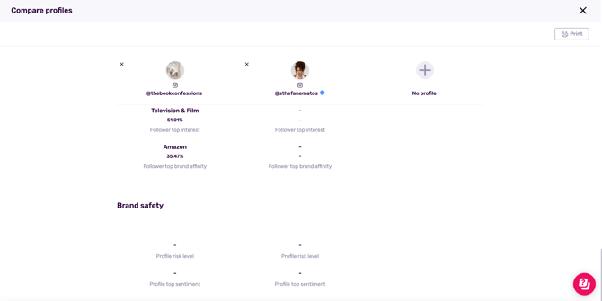 Note: In the comparison view you will also see a Brand Safety row at the bottom to help you filter and compare risk levels and profile top sentiment.