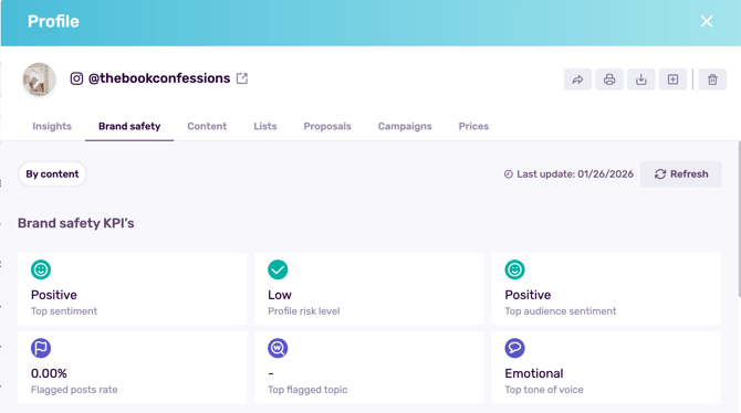 Brand Safety helps you quickly understand whether an influencer is a good fit for your brand by analyzing what the creator posts and how their audience reacts. Instead of manually scrolling through feeds and comments, you get structured insights you can use to make partnership decisions faster.