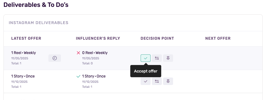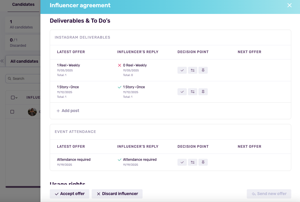 Note: You can have as many offers and counters as you want. However, once you decline a counteroffer, the influencer will appear as rejected and this status cannot be reversed.