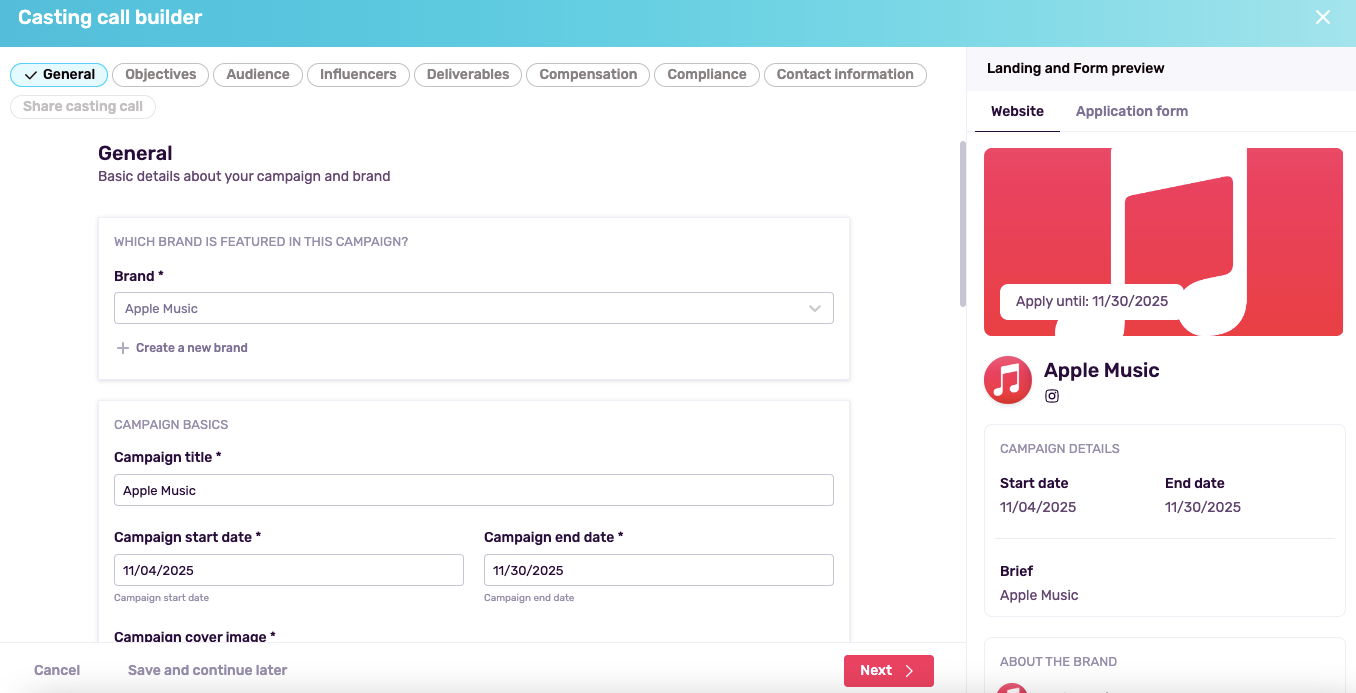 Build a new Casting Call and decide which sections, like fees, content deliverables, or usage rights, are open for negotiation. Each section includes a simple toggle to mark it as negotiable or non-negotiable.