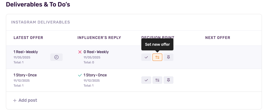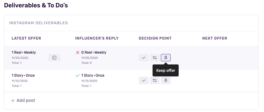 This feature allows you to define which parts of your brief are open to discussion and which are fixed. Influencers can then review your offer, propose edits, or accept the agreement right away, while every action is automatically tracked in one shared view.