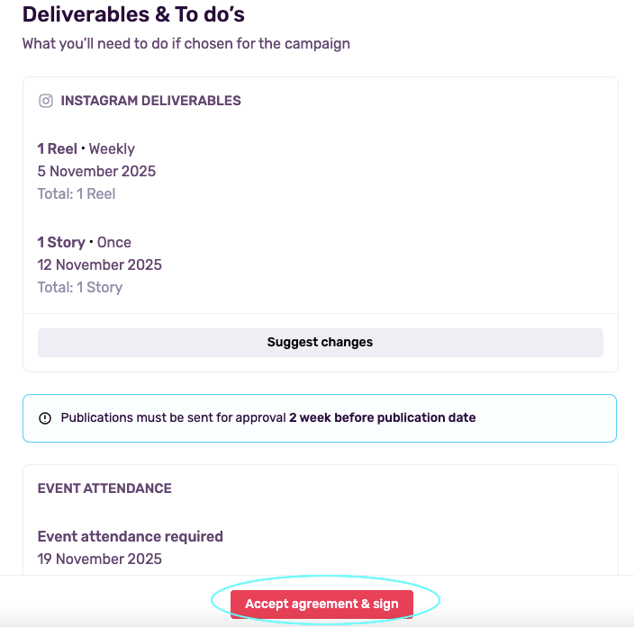 When both parties reach an agreement, each “signs” digitally, confirming names and dates to make the deal official. The influencer is then added directly to the campaign with all terms locked and visible to both sides.