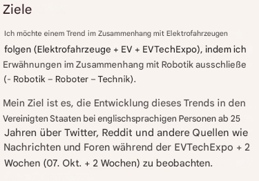 „Ich möchte Unterhaltungen über Elektrofahrzeuge (ElectricVehicles, EV, EVTechExpo) in den USA überwachen, wobei Erwähnungen im Zusammenhang mit Robotik ausgeschlossen sind. Ich konzentriere mich auf englischsprachige Personen über 25 auf Twitter, Reddit und Blogs während der EVTechExpo und in den darauffolgenden zwei Wochen.“