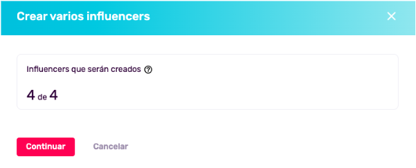 Si pulsas en Crear Influenciadores, aparecerá un cuadro emergente y sus influenciadores se crearán después de pulsar continuar.
