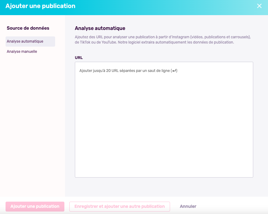 À partir de votre rapport existant, sélectionnez Ajouter une publication sur la droite. Une fenêtre contextuelle s'ouvre alors avec les deux options disponibles. Pour l'analyse automatique, commencez par coller l'URL de n'importe quelle publication Instagram, TikTok ou YouTube. Une fois que vous en avez ajouté jusqu'à 20, cliquez sur Ajouter une publication.