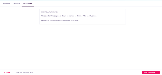 Pro Tip: If you need to stop a sequence for a specific influencer manually (e.g., they replied via DM instead of email), you can manually select them in the sequence dashboard and click Unenroll/Stop.