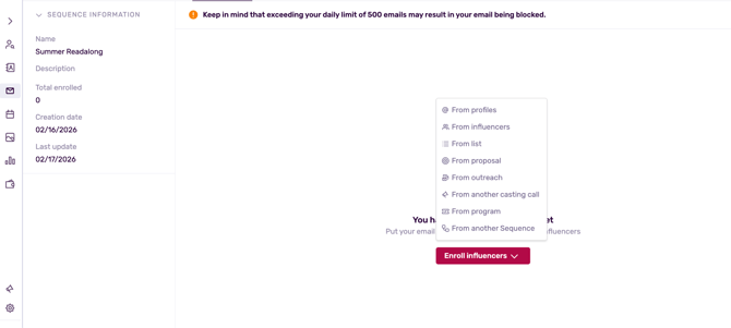 Once your sequence is set up, you can add influencers to a sequence from almost anywhere in the platform (Lists, IRM, Profile views, etc.).