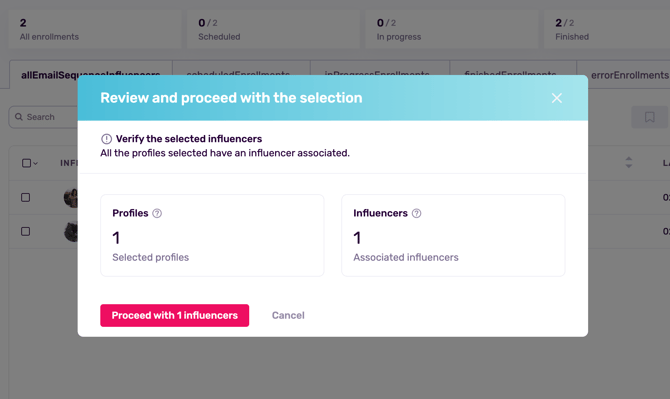If an influencer in your selection does not have an email address, the system will warn you and exclude them. A pop up will also appear if the influencer is in another existing sequence so you can choose to either include him or her or not.