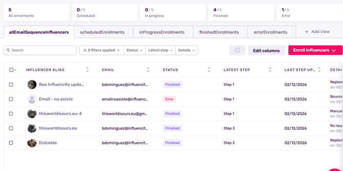 - Finished: The influencer has either completed all steps OR they have replied (which automatically finishes the sequence).