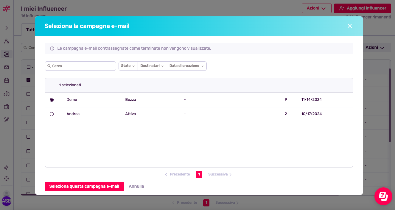 Aggiunga gli influencer direttamente alla nostra funzione di outreach. Dalla scheda Influencer o dalla scheda Elenco, seleziona gli influencer che desidera includere nell'outreach e apparirà un pop up per scegliere una campagna di outreach. Premendo sull' e-mail di selezione della campagna, potrà includere gli influencer nella campagna.