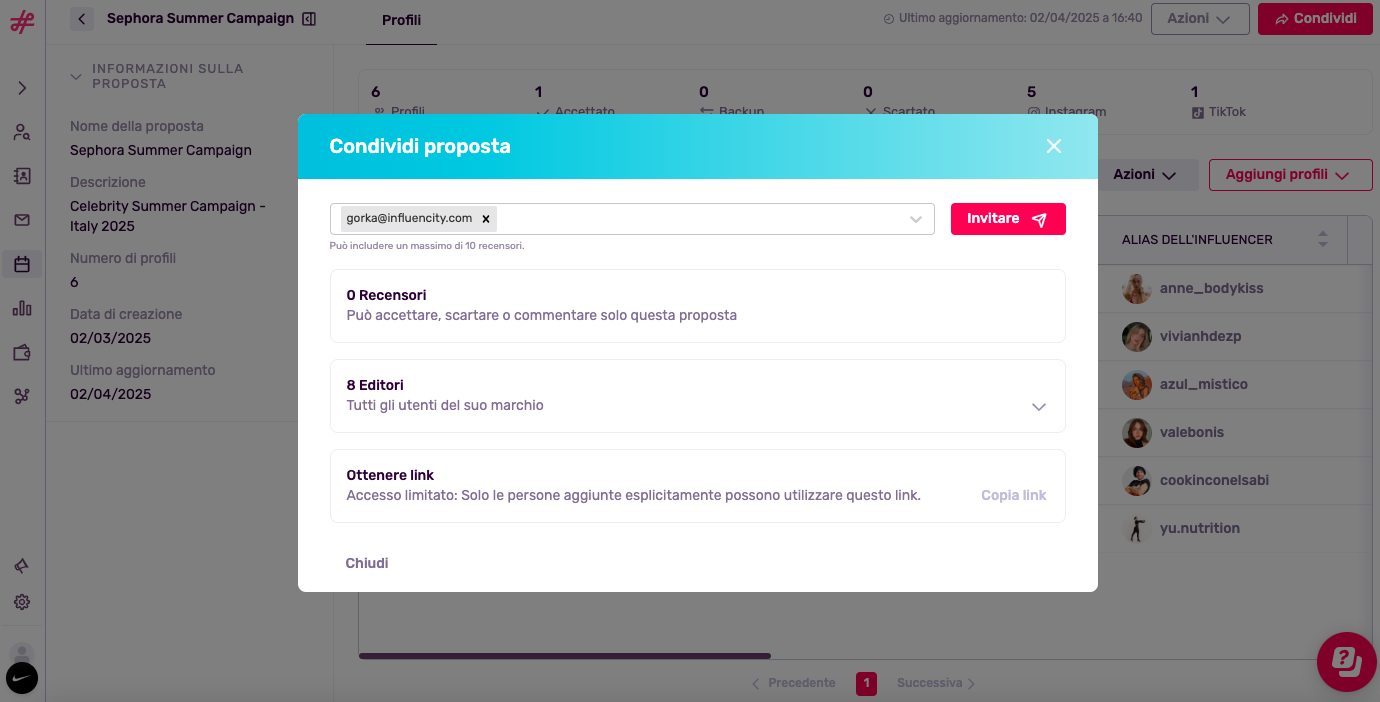 Si ricordi che tutti gli utenti del marchio all'interno di Influencity hanno i permessi di modifica completi, che consentono loro di gestire i profili, aggiornare gli stati e apportare modifiche alla proposta.
