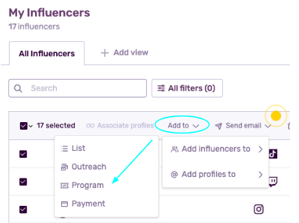 - Select profiles from a list, convert them into influencers, and then send them to programs.