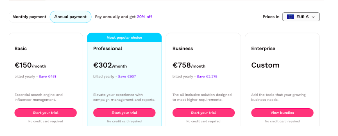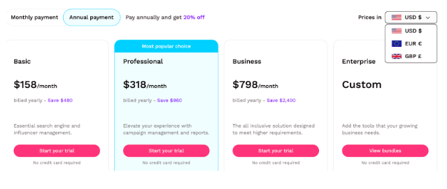 Pague a sua subscrição da plataforma Influencity em três moedas diferentes: euros, libras e dólares. Esta melhoria proporciona-lhe uma maior flexibilidade e elimina o incómodo das taxas de conversão flutuantes, assegurando um processo de transação normalizado e sem problemas.