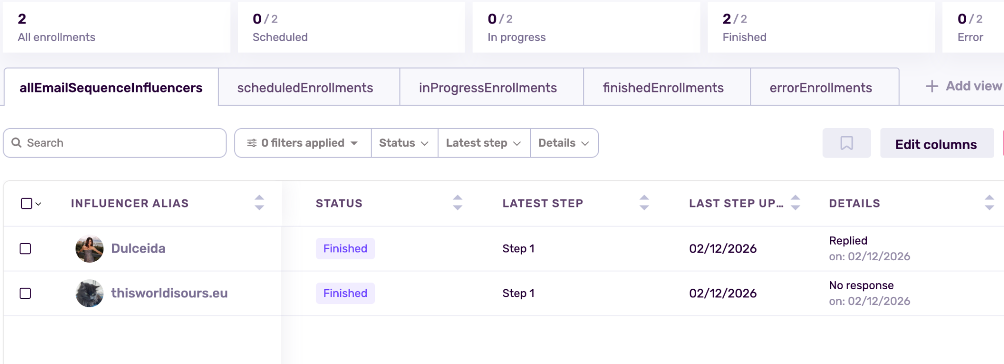 Note: If a sequence only has one email, the influencer will skip this stage and go directly to Finished immediately after sending, as there are no further steps to complete.